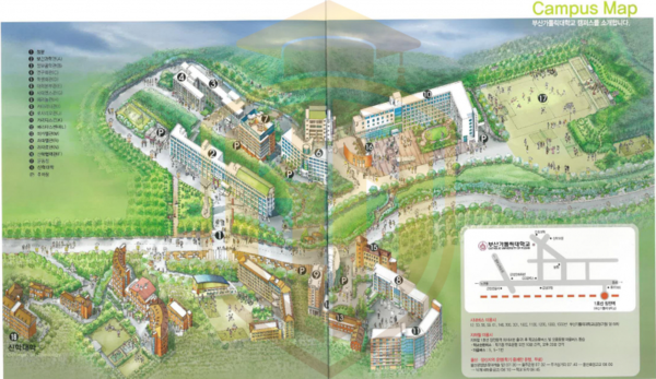 Trường cách ga tàu điện ngầm Oncheonjang chỉ vài phút đi xe buýt, dễ dàng di chuyển đến các khu vực trung tâm như Seomyeon, Haeundae hay Nampo-dong. Khu vực xung quanh trường là nơi kết hợp giữa không gian học tập hiện đại và bầu không khí trong lành, gần núi Geumjeongsan, thích hợp cho sinh viên học tập và rèn luyện sức khỏe. Với vị trí này sinh viên vừa có thể trải nghiệm cuộc sống đô thị sôi động của Busan vừa tận hưởng môi trường học tập yên tĩnh, an toàn.